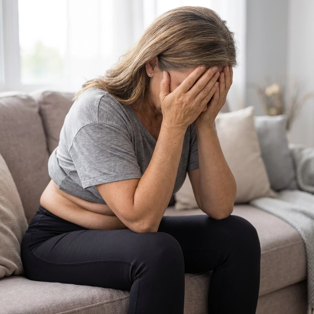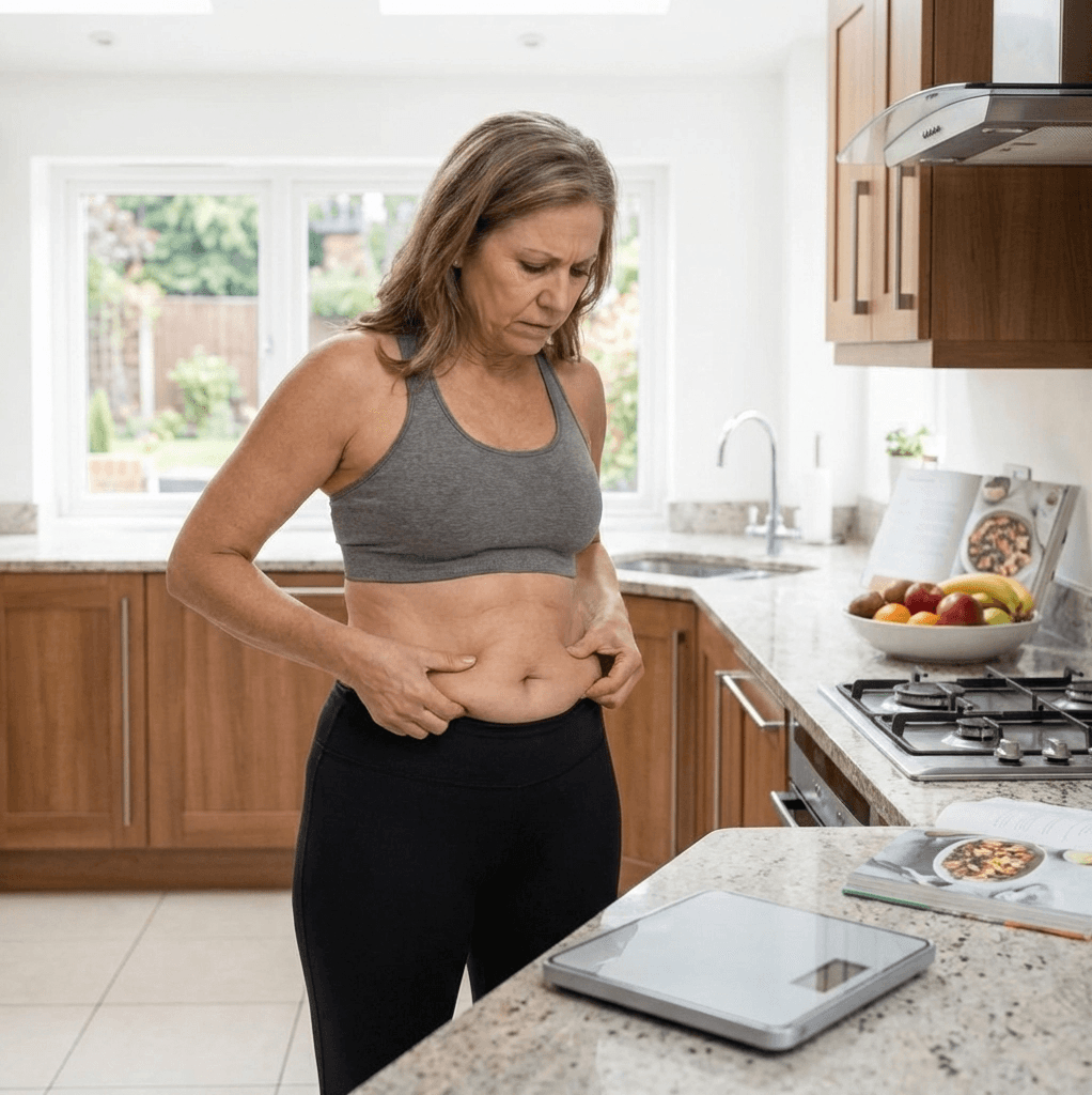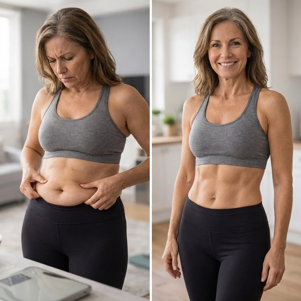 Monatelang hartnäckiges Bauchfett seit den Wechseljahren, das selbst mit Diät und Sport nicht verschwinden wollte.